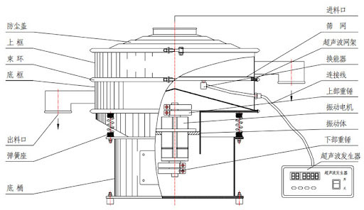 流通式超声波筛由防尘盖、进料斗、超声波振动系统、筛网、出料口、减震底座、电机等组成。超声波换能器均匀分布于筛网两侧,通过高频振动快速破除物料粘连,搭配耐磨不锈钢筛网,实现精细分级。中间层设导流板引导物料流通,底部减震底座采用橡胶减震垫,减少运行噪音与设备损耗。